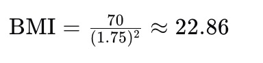 例如,如果一个人的体重是 70 千克,身高是 1.75 米,那么他的 BMI 计算如下: